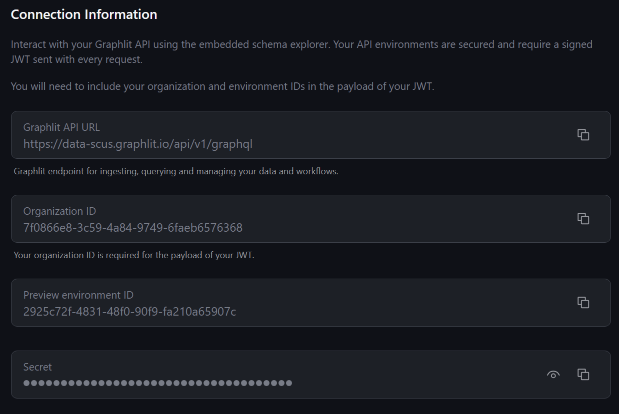 <table><thead><tr><th width="200">Credential</th><th>Description</th></tr></thead><tbody><tr><td><strong>Organization ID</strong></td><td>Your organization identifier (shared across projects)</td></tr><tr><td><strong>Environment ID</strong></td><td>Your environment identifier (Preview or Production)</td></tr><tr><td><strong>JWT Secret</strong></td><td>Authentication secret for API access</td></tr></tbody></table>